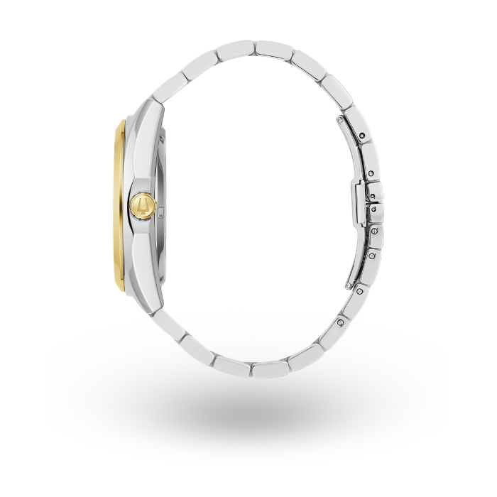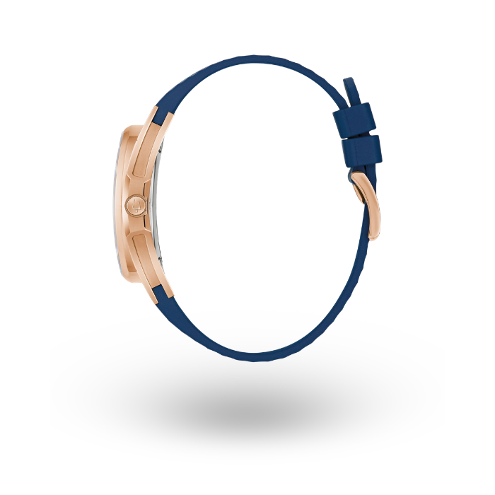 Movimiento HPQ con una frecuencia de 262 kHz, tecnología exclusiva de Bulova de 3 manecillas con subcarátula de segundero. Caja realizada en acero inoxidable acabado PVD oro rosa. Carátula azul con polvo de diamantes, indicadores y manecillas luminiscentes en oro rosa, subcarátula de segundero.