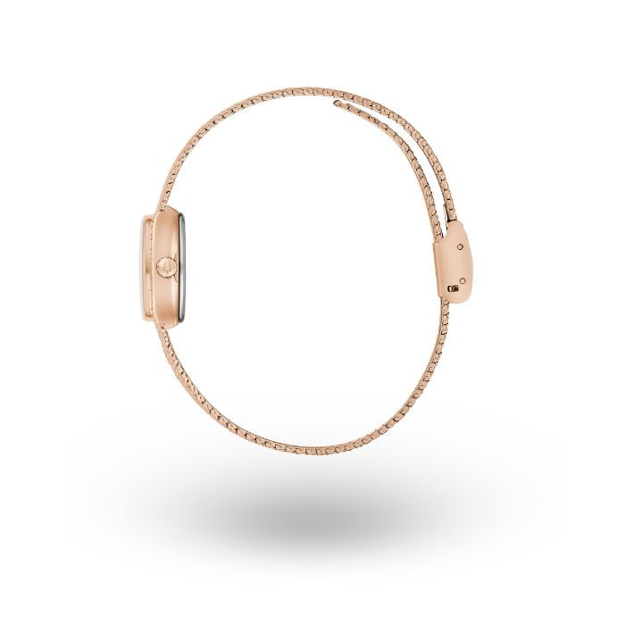 Viaje en el tiempo al brillo y el glamour de la década de 1970 con el reloj clásico para mujer «Goddess of Time» de Bulova. Inspirándose en el diseño atemporal de los relojes *vintage* «Goddess of Time» de Bulova, su caja de acero inoxidable en tono oro rosa —con forma *tonneau*— presenta una superficie superior texturizada y un bisel de acabado pulido brillante, integrándose a la perfección con una pulsera de malla texturizada dotada de un cierre deslizante ajustable, con un rango de 6 a 7 ¾ pulgadas. Cada esfera, elaborada en auténtico ojo de tigre marrón con vetas, es absolutamente única y está adornada con índices aplicados en tono oro rosa a juego con las manecillas; asimismo, la propia «Goddess of Time» de Bulova aparece grabada en el fondo de la caja con un nivel de detalle exquisito. Siéntase verdaderamente divina con este deslumbrante reloj Bulova para dama.