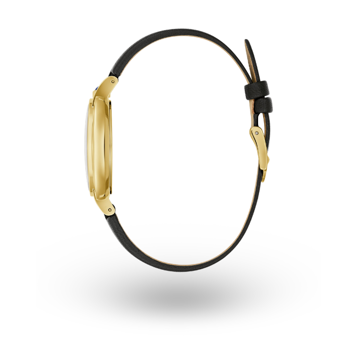 Carátula blanca, indicadores en números romanos en negro y manecillas en dorado. Correa de piel suave en negro, broche tipo hebilla de 3 piezas.