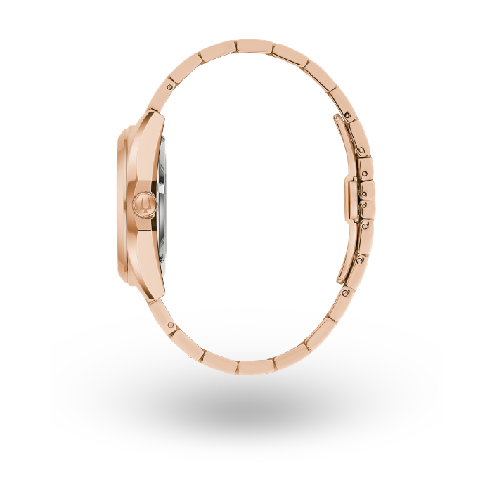 Reloj Bulova para Caballero, colección Surveyor. Movimiento mecánico de cuerda automática de 3 manecillas y fechador en posición de las 3Hrs, con gota de aumento. 42 horas de reserva de marcha. Caja y brazalete realizados en acero inoxidable acabado PVD oro rosa broche desplegable de doble pulsador.