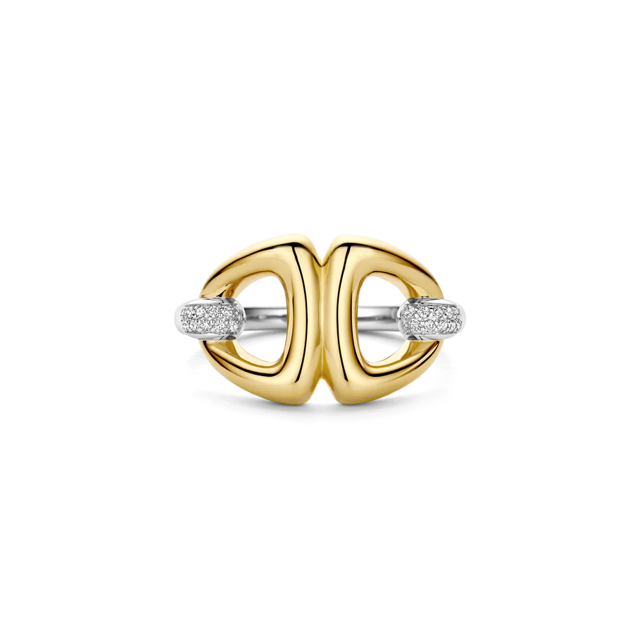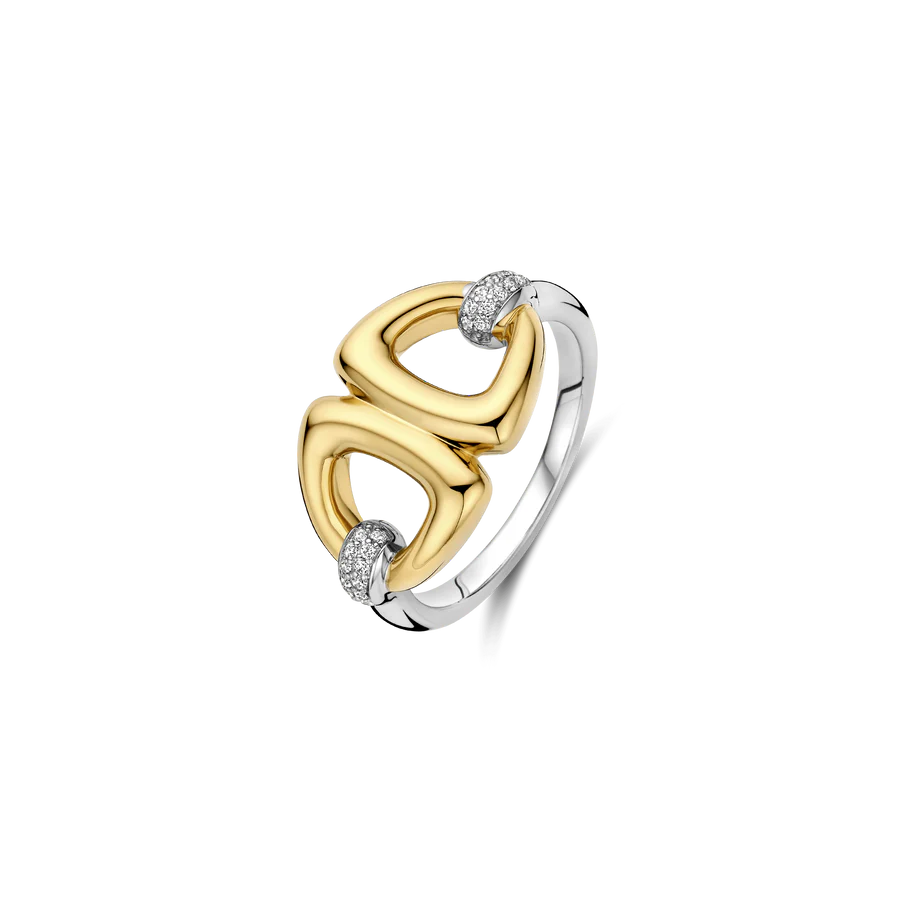 Luce una sofisticación elegante con este anillo TI SENTO de plata bañada en oro. Esculpido en plata de ley 925, este anillo de alto brillo presenta un acabado en platino brillante y deslumbrante, mientras que un audaz diseño de triángulo abierto, bañado en radiante oro amarillo, cobra protagonismo. Dos tapas bañadas en platino, engastadas con brillantes circonitas cúbicas blancas, le dan forma, aportando un brillo sutil y un refinado contraste de tonos. Llévalo para realzar un traje a medida o para realzar un look de noche con un toque escultural. Totalmente libre de níquel e hipoalergénico, esta pieza combina un brillo digno de una galería con una comodidad agradable para la piel en la que puedes confiar.