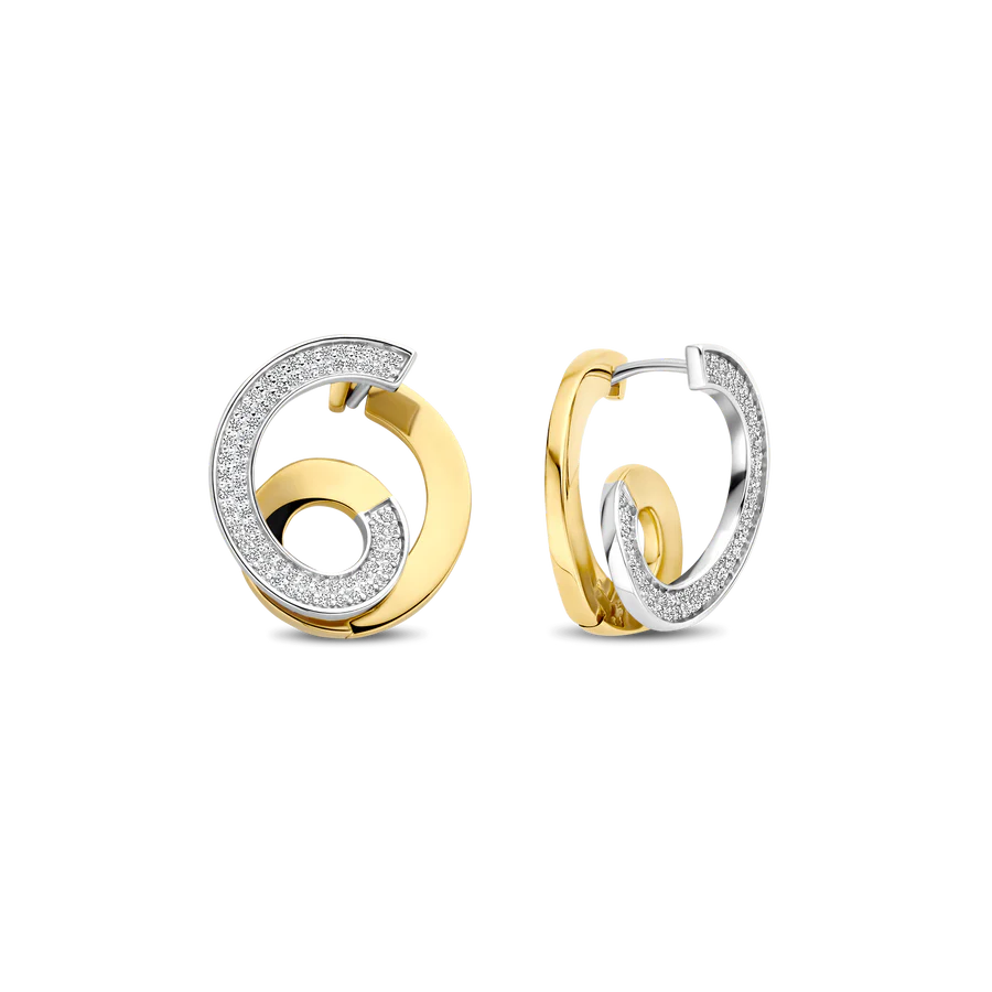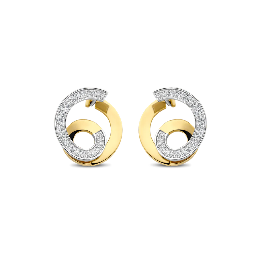 Luce una elegancia escultural con estos pendientes TI SENTO de plata bañada en oro. Elaborados en plata de ley 925 de primera calidad y con un radiante acabado en oro amarillo, su diseño de doble espiral atrae la mirada con una dinámica sensación de movimiento. Una espiral interior y exterior engastada con pavé de circonitas cúbicas brilla, creando un hipnótico juego de luz y dimensión. Con 18 mm de diámetro, estos pendientes ofrecen una geometría audaz con un suave giro, perfectos para realzar looks minimalistas o añadir refinamiento a tus trajes de noche. Sin níquel e hipoalergénicos, son tan cómodos como impactantes.