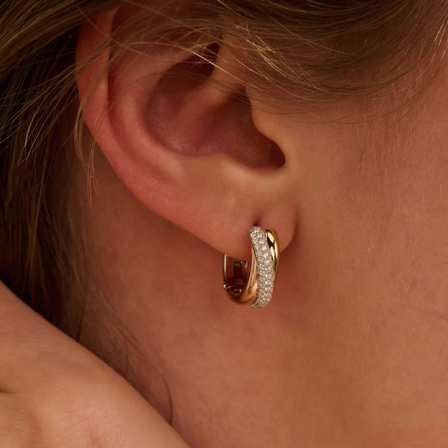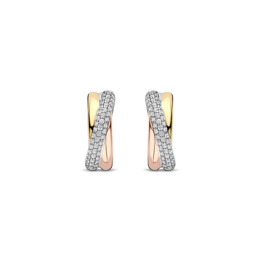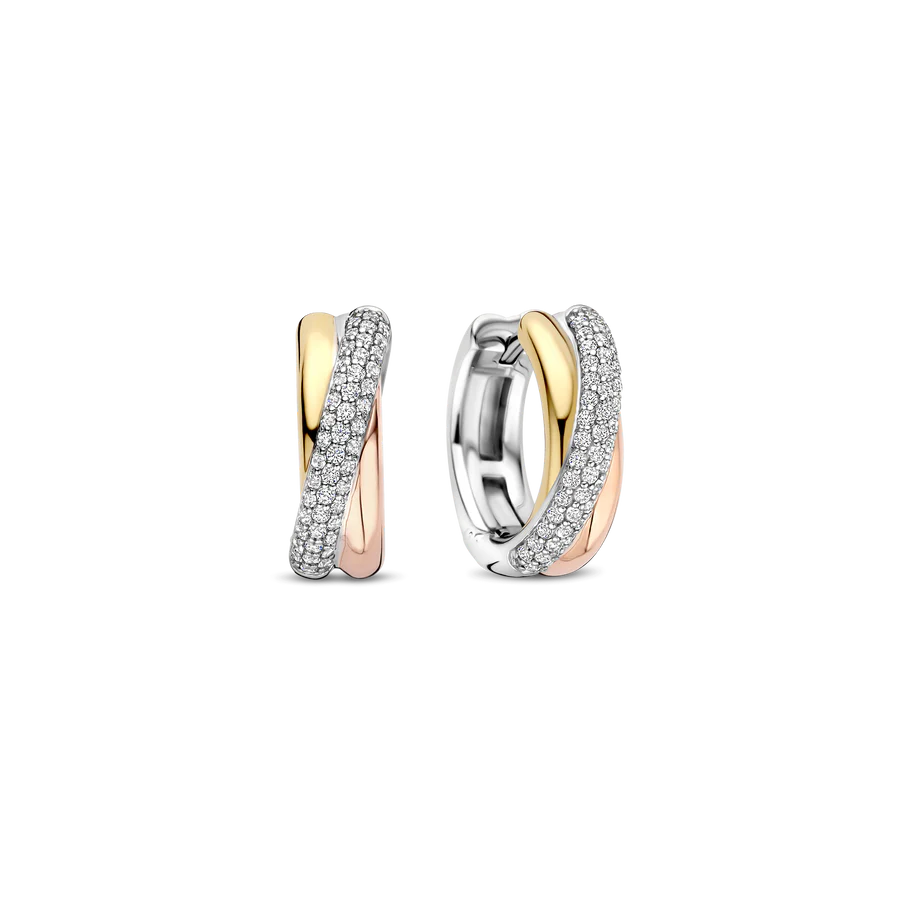Celebra el equilibrio moderno con estos pendientes de plata tricolor TI SENTO. Elaborados en plata de ley 925, cada aro de 16 mm combina un radiante oro amarillo, un delicado oro rosa y un elegante baño de platino en un fluido diseño cruzado. Una amplia cinta de circonitas cúbicas blancas engastadas en pavé se curva a lo largo del frente, capturando la luz con cada movimiento. Su silueta escultural aporta profundidad y contraste, mientras que su tamaño compacto los hace perfectos para el día a día con un toque refinado. Sin níquel e hipoalergénicos, estos pendientes ofrecen una comodidad duradera y una luminosidad refinada para cualquier ocasión.