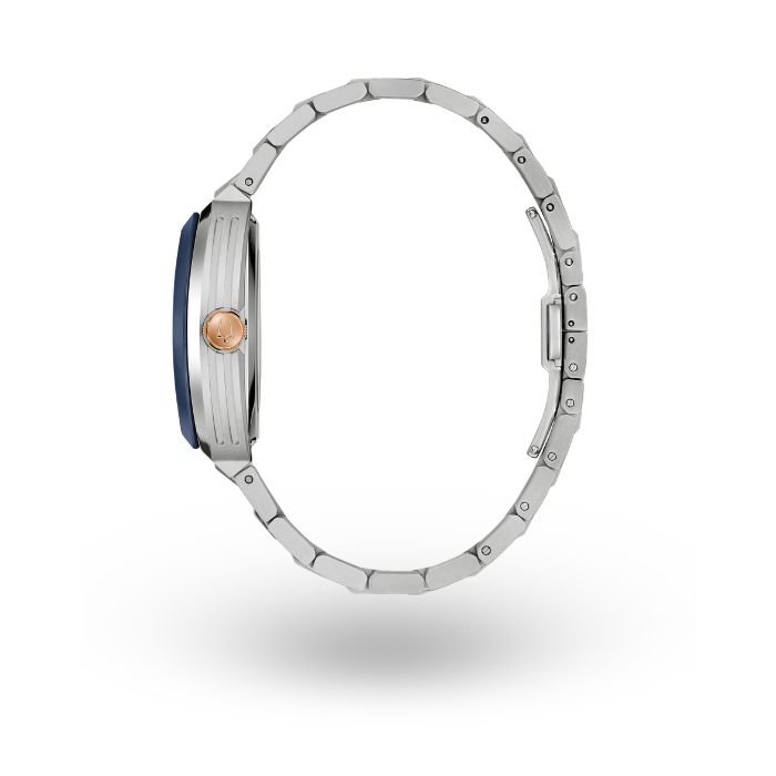 Este reloj Bulova para hombre, de la colección Maquina, ofrece un diseño vanguardista y audaz. Cuenta con una caja de acero inoxidable de 40 mm en tonos oro rosa y plata, con cristal de zafiro curvado, bisel azul y brazalete de acero inoxidable plateado con cierre desplegable con pulsador. La esfera azul con patrón, aro y puentes negros, presenta agujas e índices en oro rosa con relleno luminiscente y una ventanilla central que revela el mecanismo interno del movimiento automático de 21 rubíes, visible también a través de un fondo transparente, esqueletizado y con una reserva de marcha de 42 horas. Con su corazón mecánico y su diseño moderno e inigualable, este reloj Bulova para hombre ofrece una expresión de estilo única y personal.