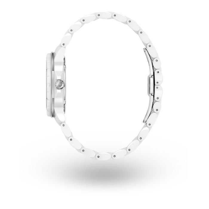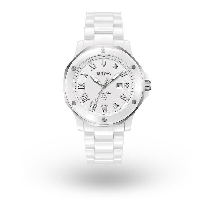 Captura el ritmo alegre y animado de la música icónica de Marc Anthony con este nuevo reloj para mujer de Bulova, elaborado en colaboración con el legendario cantante para crear el compañero de verano perfecto. La caja refrescante y brillante está hecha de cerámica blanca pulida y acero inoxidable plateado, mientras que la resistencia al agua de 100 m ofrece la confiabilidad que necesitas desde la playa hasta el sendero. La esfera completamente blanca presenta una ventana de fecha, manecillas luminiscentes y números romanos acentuados por tres marcadores de hora de diamantes a la 1, las 3 y las 5 en punto, números elegidos por Anthony por su significado personal. Completando este reloj listo para la playa, hay una pulsera de cerámica blanca con un cierre desplegable con pulsadores para un ajuste seguro y cómodo. Para todas tus salidas a la playa, opta por este reloj para mujer de la emocionante colaboración de Bulova con Marc Anthony.