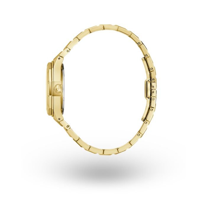 Este reloj clásico de Bulova Prestige para mujer se caracteriza por su diseño audaz y sofisticado, que combina un diseño audaz con una presencia elegante. El reloj cuenta con una caja de acero inoxidable facetada de 32 mm en tono dorado con bisel geométrico, cristal de zafiro plano con revestimiento antirreflejos, resistencia al agua de 100 m y una pulsera de 3 eslabones biselados con acabados cepillados y pulidos y un cierre desplegable con pulsador. La esfera de nácar brillante tiene agujas y marcadores aplicados en tono dorado con relleno luminiscente Super-LumiNova y una pantalla de fecha. Impresionante tanto por su modernidad como por su sofisticación, este reloj de Bulova para mujer es un compañero ideal para cualquier muñeca.