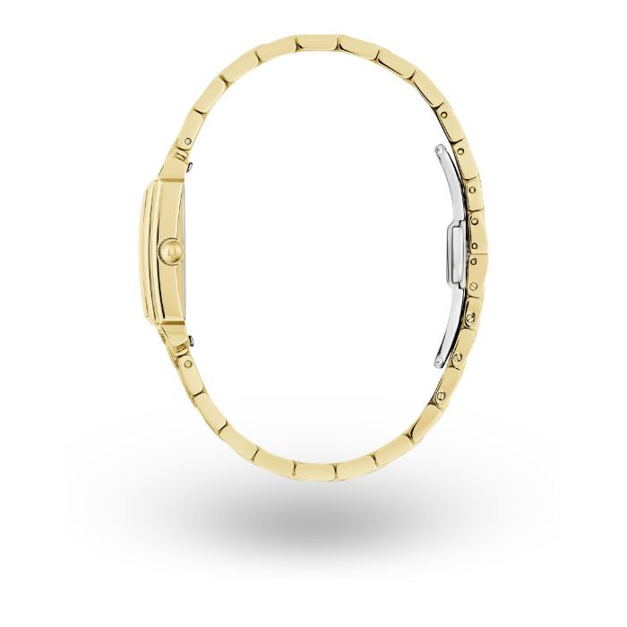 Este nuevo reloj de mujer de Bulova aporta una lujosa elegancia a la ya impresionante Colección Sutton. La refinada caja rectangular de acero inoxidable en tono dorado cuenta con un cristal mineral y un acabado que brilla intensamente a la luz. La brillante esfera de nácar está acentuada con marcadores y manecillas con números romanos en tono dorado para una apariencia de verdadera elegancia.
