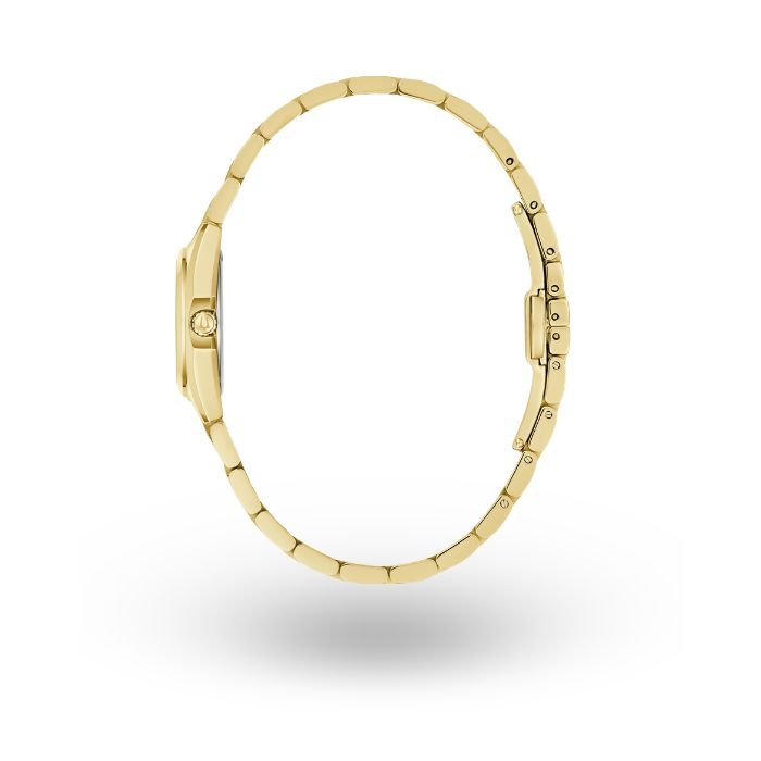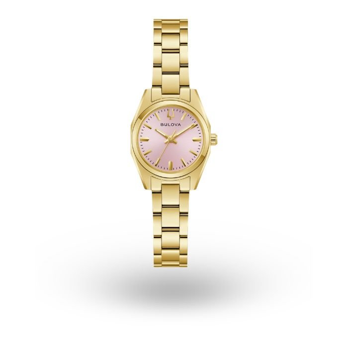 Definido por su excepcional calidad y estética sofisticada, el Surveyor de Bulova para mujer es el reloj moderno por excelencia, actualizado con una mini caja de 23 mm. Los bordes esculpidos y el facetado distinguen la caja de acero inoxidable dorado, con acabado pulido y cepillado, un cristal de zafiro plano y un brazalete de acero inoxidable dorado de tres eslabones a juego con cierre desplegable de botón y pasadores de fácil liberación. La radiante esfera rosa presenta un acabado sunburst, detalles dorados y agujas con relleno luminiscente. Para quienes buscan un lujo refinado, este reloj Bulova para mujer es el compañero perfecto para el día a día.