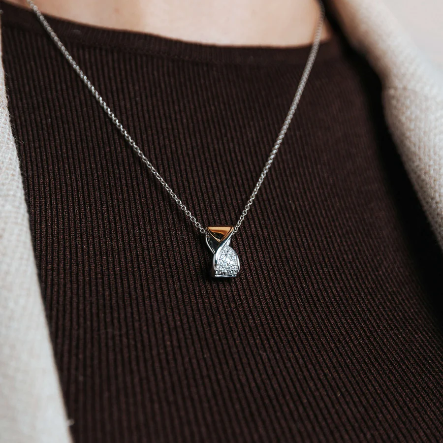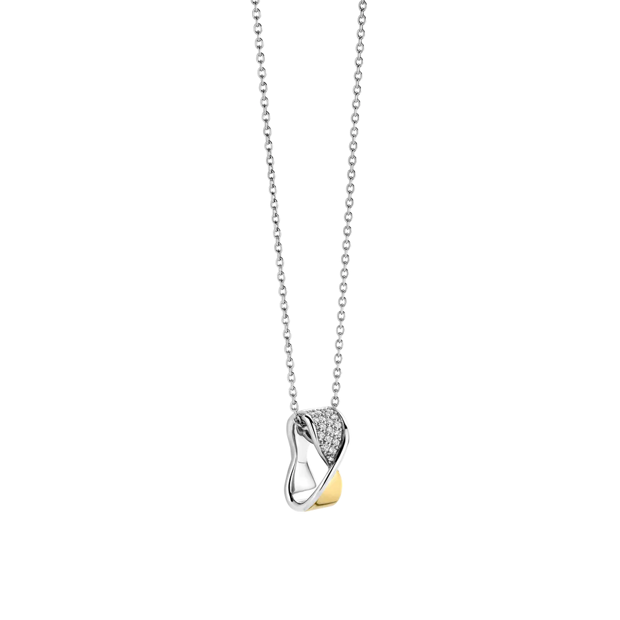 Celebre el contraste y el movimiento con este collar TI SENTO de plata bañada en oro. Esculpido en plata de ley 925, este collar presenta una silueta retorcida donde el cálido baño de oro amarillo se combina con el brillo del pavé. La sección superior del colgante brilla con circonitas cúbicas blancas engastadas a mano, mientras que la base bañada en oro pulido le aporta riqueza y elegancia moderna. Suspendido de una fina cadena de plata, se asienta con gracia en la clavícula, perfecto para una elegante combinación de capas o como detalle independiente. Este diseño combina la estructura geométrica con una feminidad fluida, lo que lo convierte en una opción versátil para estilizar tanto de día como de noche. Ya sea combinado con básicos de sastrería o tejidos fluidos, aporta un sutil toque de distinción. Sin níquel e hipoalergénico, este collar es tan cómodo como cautivador.