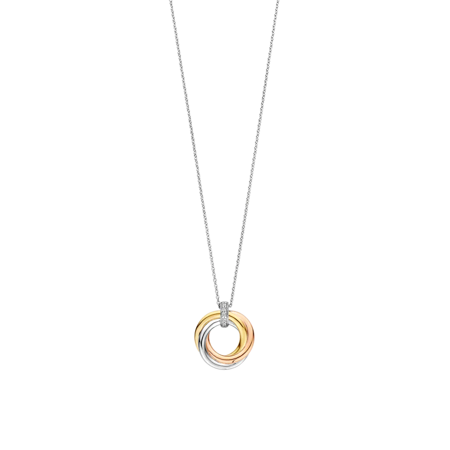 Celebra la unidad en contraste con este collar TI SENTO de plata bañada en oro . Tres anillos entrelazados, cada uno bañado en oro amarillo, oro rosa y platino, se unen en un círculo simbólico de conexión, anclado por un deslumbrante engaste pavé. Elaborado en plata de ley 925 de primera calidad, este collar juega con tonos cálidos y fríos para crear una composición armoniosa y contemporánea. El elegante colgante de 20 mm se mueve libremente a lo largo de una delicada cadena de plata, capturando la luz a cada paso. Ya sea para lucirlo como una pieza elegante o con cadenas minimalistas, este diseño tricolor aporta significado y movimiento a cualquier look. Un regalo ideal o una pieza de autoexpresión, que combina belleza atemporal con modernidad escultural. Sin níquel e hipoalergénico para una lujosa comodidad diaria.