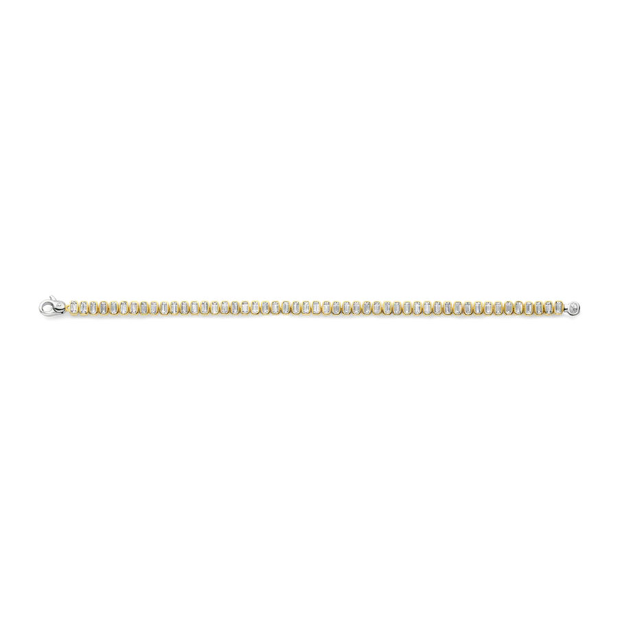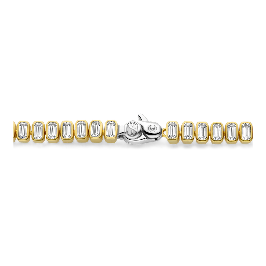 Disfrute del lujo atemporal con esta pulsera de tenis TI SENTO de plata chapada en oro, un diseño cautivador que celebra la combinación de plata y oro amarillo. Esta exquisita pulsera presenta una serie de circonitas cúbicas blancas de talla esmeralda, cada una meticulosamente engastada en plata chapada en platino y oro amarillo. Elaborada en plata de ley 925, la pulsera luce tonos plateados fríos y cálidos dorados que le confieren un encanto cautivador. Su elegante diseño, moderno y clásico a la vez, la convierte en una pieza versátil que se adapta con naturalidad tanto al día como a la noche. Ya sea que prefiera un look minimalista o con capas, esta pulsera de plata añade un toque de sofisticación a cualquier conjunto. Esta pieza es un testimonio del arte de la joyería fina, ofreciendo una armoniosa combinación de lujo y estilo contemporáneo. Elaborada con cuidado para pieles sensibles, esta pulsera hipoalergénica y sin níquel garantiza comodidad y calidad duraderas.
